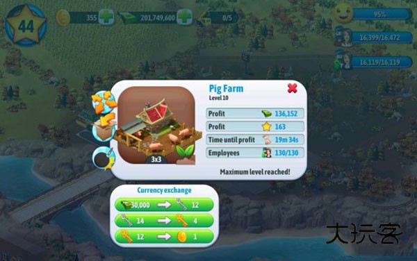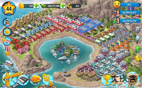 4.有时间时多建造耗时短,升级快的建筑,没时间多建造时间长利润高的,我用金钥匙兑换了一个巨坑5×5水上乐园,占地方,利润少,当然也有多的;