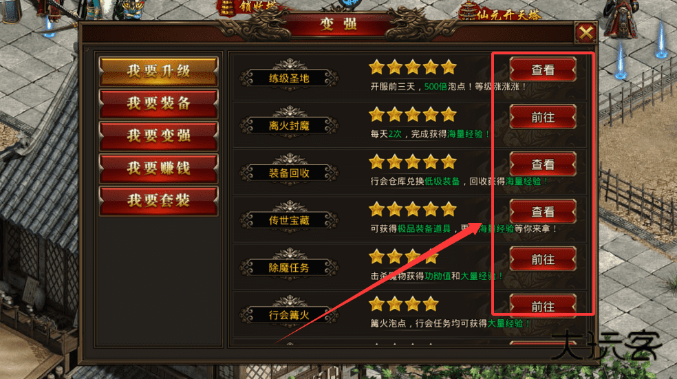 4、点击“我要变强”按钮,里面提供了多种提升途径,比如练级圣地或装备回收,根据指引前往就能快速成长了。