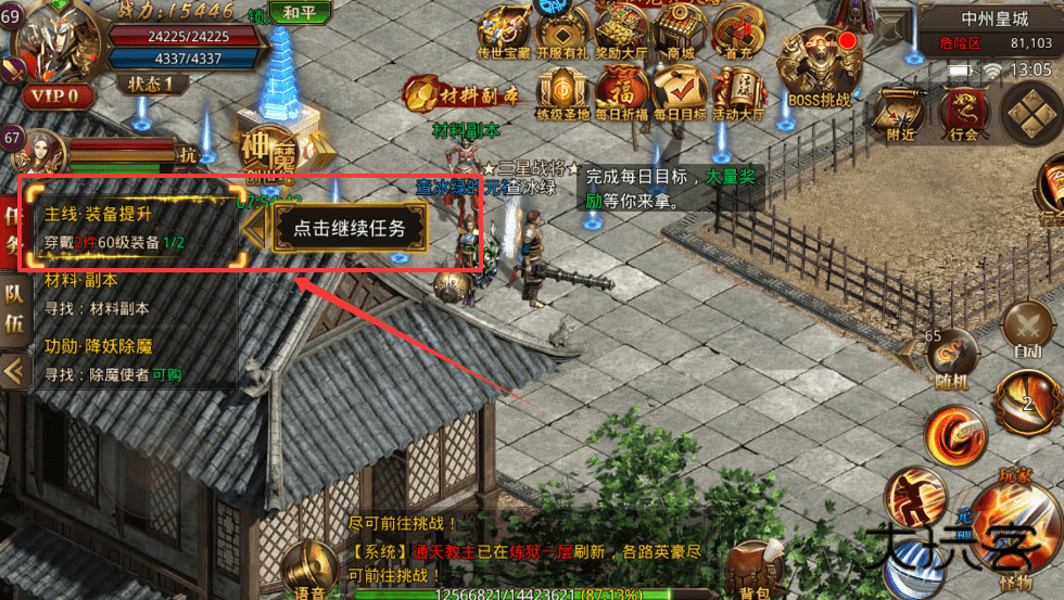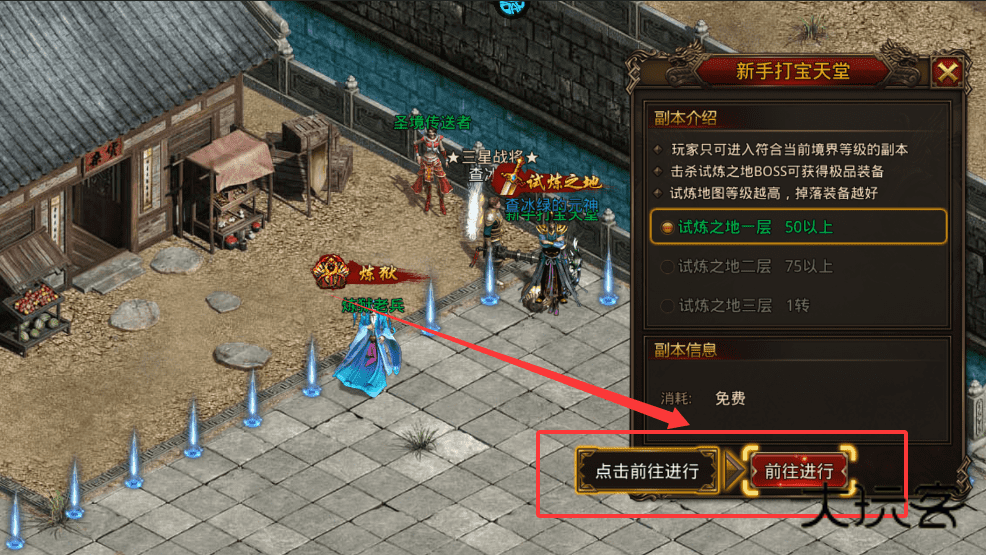 2、想要装备的话,可以去“新手打宝天堂”,根据自己等级选择对应副本,点击免费进入,击败boss就有机会获得。