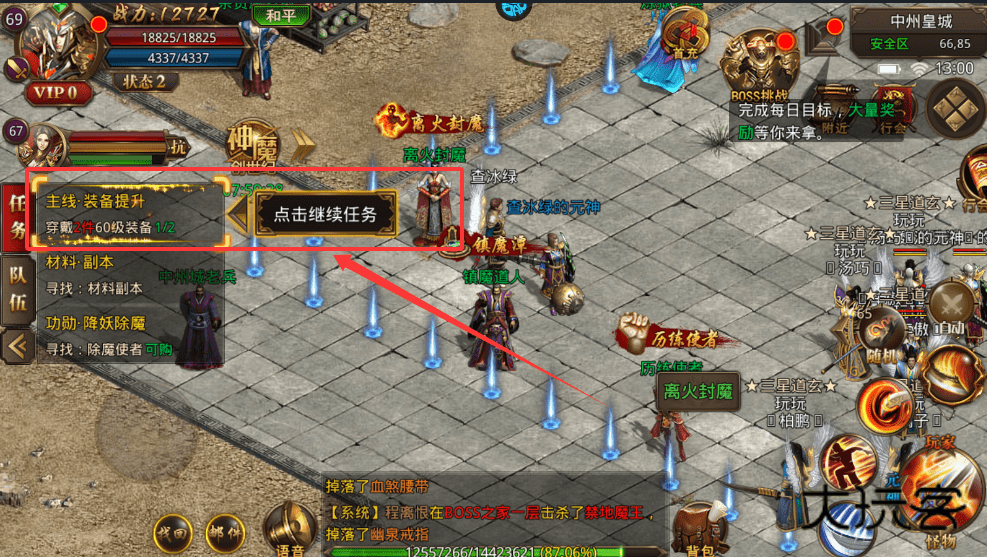 1、进入游戏先看左侧任务栏,完成主线任务如穿戴高级装备,是快速提升战力的关键。