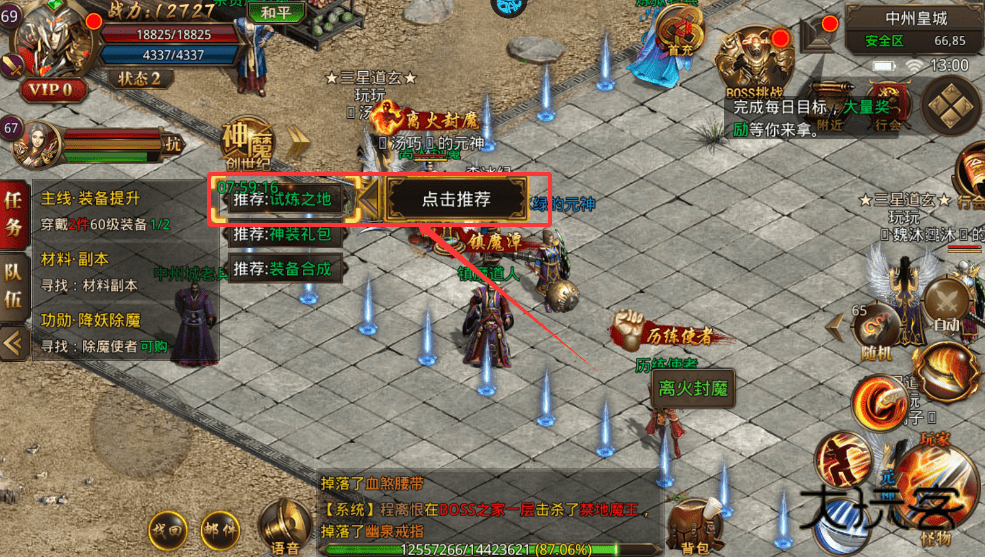 2、主界面中央的“点击推荐”按钮很实用,可一键引导你前往试炼之地等当前最适合的玩法。