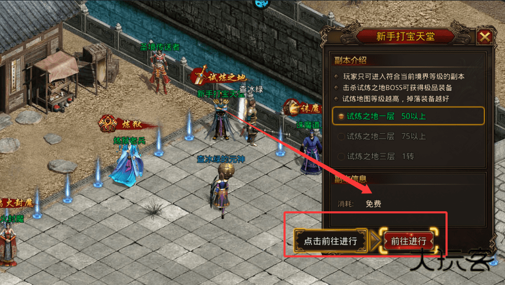 3、想打宝可寻找“新手打宝天堂”入口,选择符合自身等级的试炼之地层数前往,击杀BOSS获取装备。