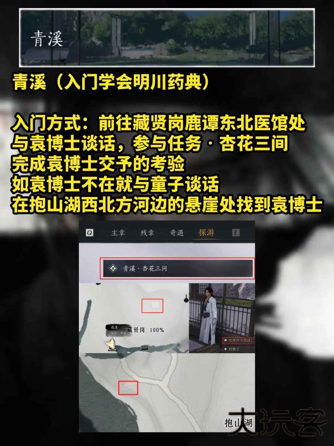 入门方式:前往藏贤岗鹿谭东北医馆处与袁博士谈话,参与任务 杏花三间