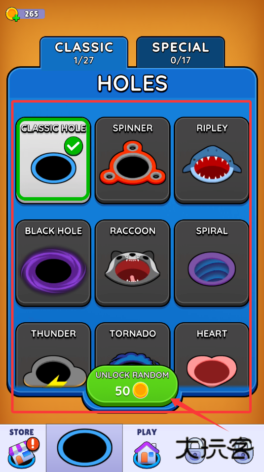 2、在关卡库界面可使用金币解锁新的黑洞皮肤,例如“RACCOON”或“HEART”等样式。部分皮肤需达成特定成就获取,而“UNLOCK RANDOM”选项则提供随机解锁功能。