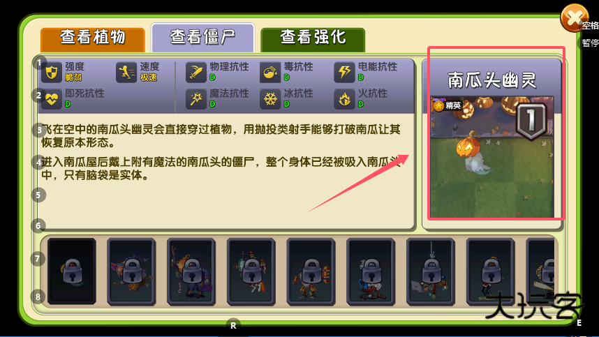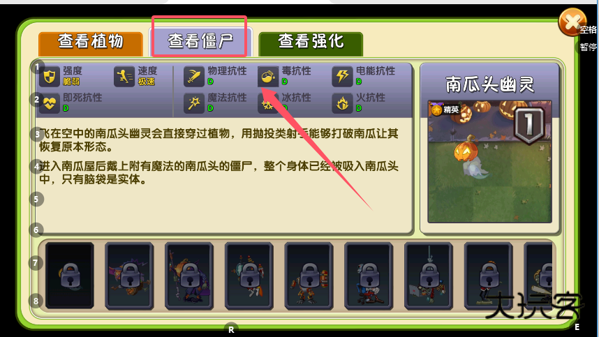 2、点击“查看僵尸”进入僵尸资料库。在这里,可以通过左侧的列表选择想了解的僵尸,右侧便会同步显示该僵尸的放大形象、具体名称、生命值以及一段描述其特殊行为。