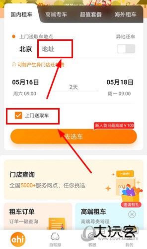 1、在软件的首页中可以在“去选车”的功能上方有一个“上门送取车”的选项,勾选上即可,然后点击上方的“地址”。