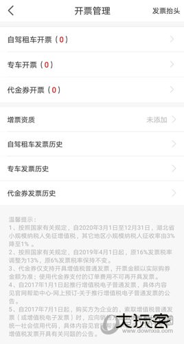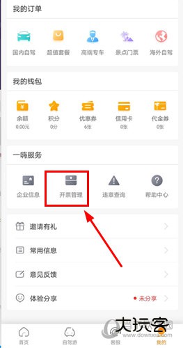 1、打开一嗨租车APP,在“我的”个人信息设置界面中选择点击“开票管理”的功能选项。