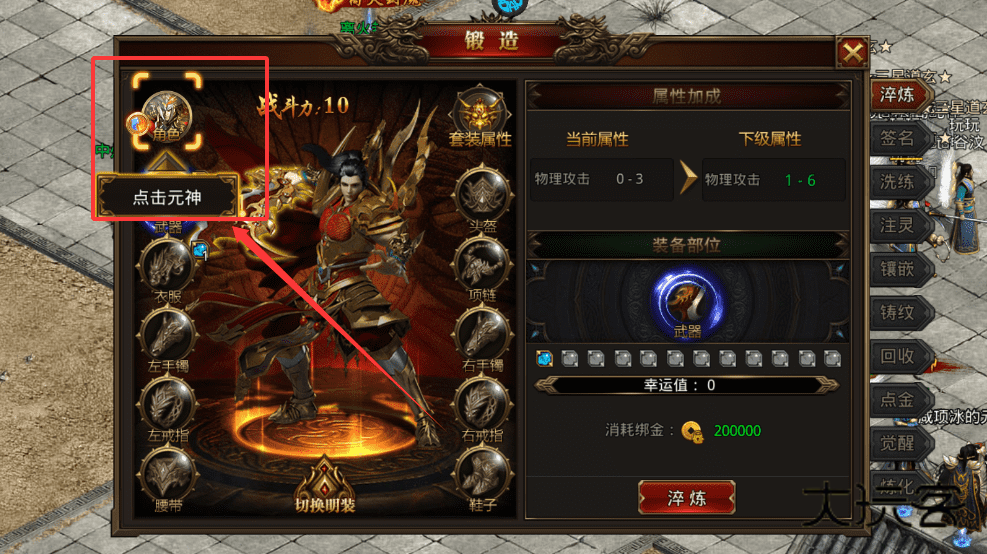 4、进入角色界面,查看装备属性并进行淬炼以提升战力。