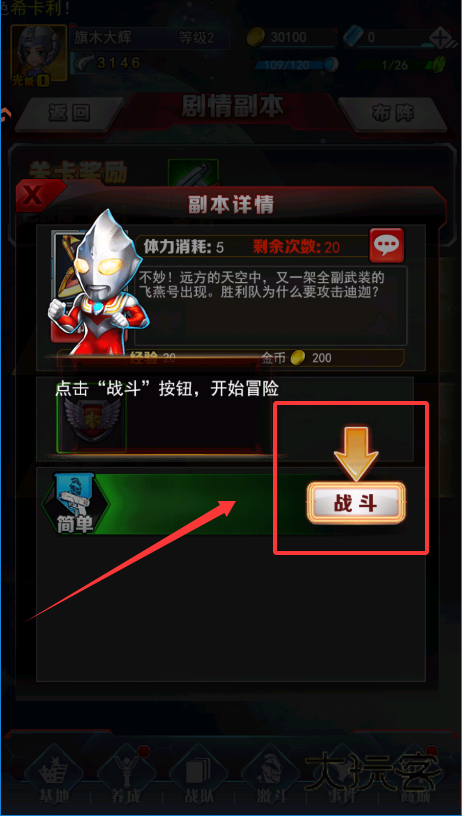 3、游戏里有个“战斗”界面,在“激斗”或“剧情副本”里能找到。打副本前要选难度,比如“简单”模式,会显示消耗多少体力。选好后点右边那个很大的“战斗”按钮就可以开打了。
