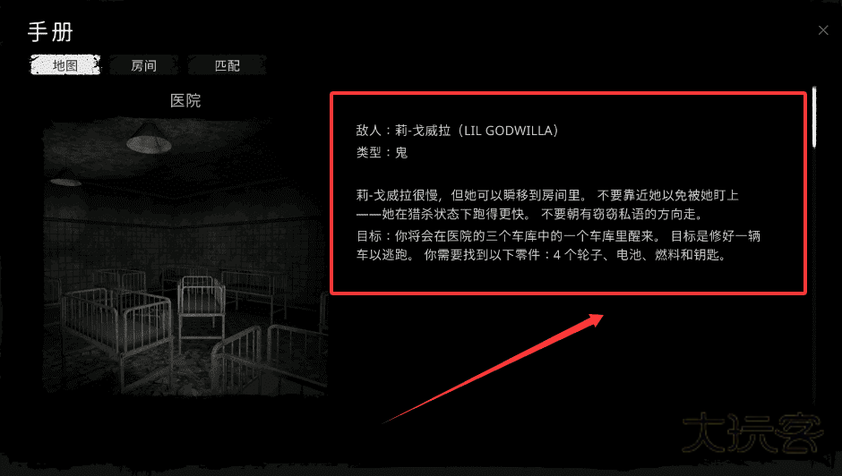 3、注意敌人莉-戈威拉是鬼类型,她移动较慢但会瞬移,避免靠近她,也不要朝有窃窃私语的方向走,以免触发她的猎杀状态。