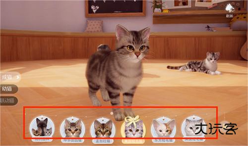 1、游戏初始会进入猫舍场景,其中展示中华田园猫、孟加拉猫与美短等多个品种。
