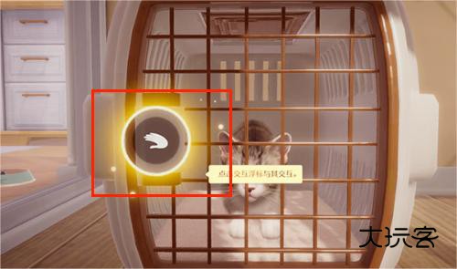 4、将猫咪带回家后,通过点击屏幕上出现的互动标识来实现爱抚、玩耍等操作。
