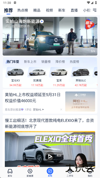3、底部“发现”栏目,有着众多热门车辆推荐文章、视频、资讯浏览。