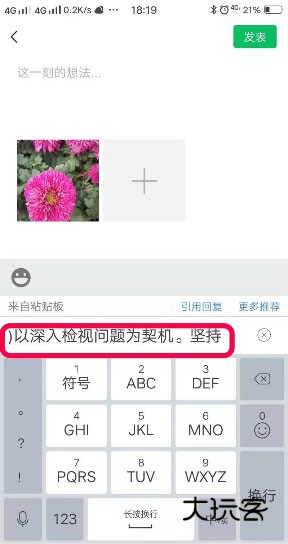 3、复制你想要发表的内容,进入”微信袭“朋友圈界面,点击一下空白处,就会出现图中红框标记的你复制的内容;