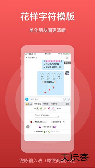 《微脉输入法》是专为微商用户所打造的一款手机输入法软件,内置各种有趣的表情斗图、花样字符模板、特殊字体等,有了它,让你的聊天变得更加的高级快速,还可以提高团队协作效率。该软件采用了全新的智能输入模式,不仅支持正常的拼音九键、26键、笔画、手写、五笔、双拼打字,语音输入转文字,而且支持用户创建词条,比如品牌、团队或个人IP的介绍,其中最值得一体的是解决朋友圈文字折叠问题。欢迎大家在189下载网下载微脉输入法