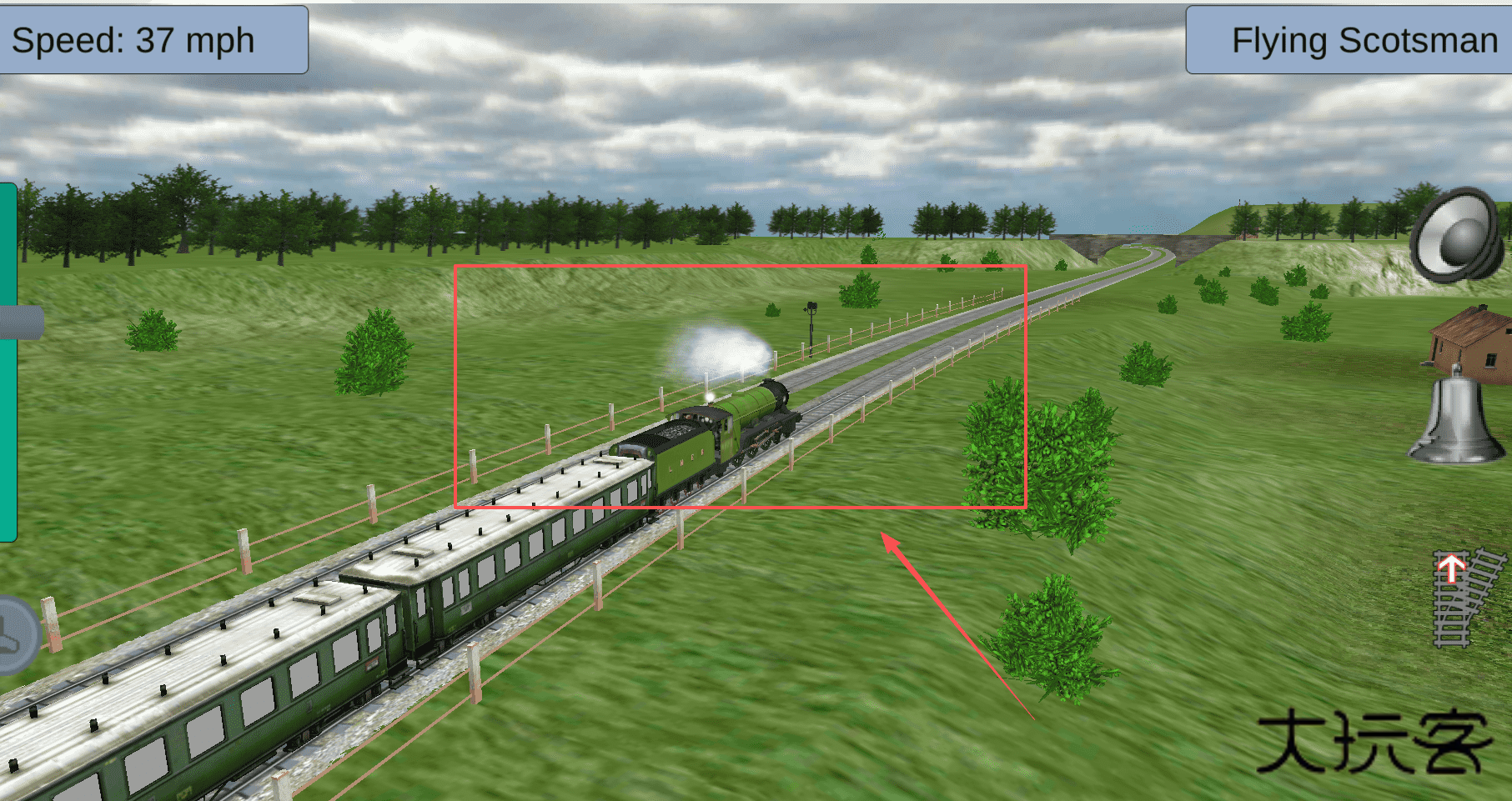 2、火车开动后,记得留意屏幕上的速度显示哦,就像材料里“飞行苏格兰人”号能达到100英里那么快。