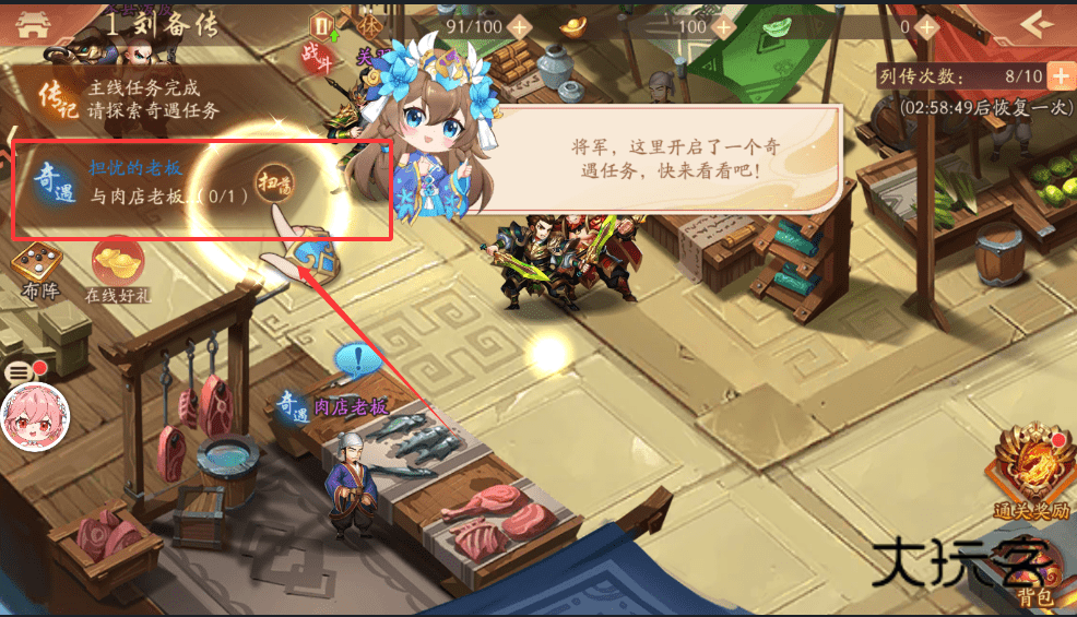 1、建议你去探索奇遇任务,比如这里的“担忧的老板”,你需要找到肉店老板对话,这个就是关键步骤了。
