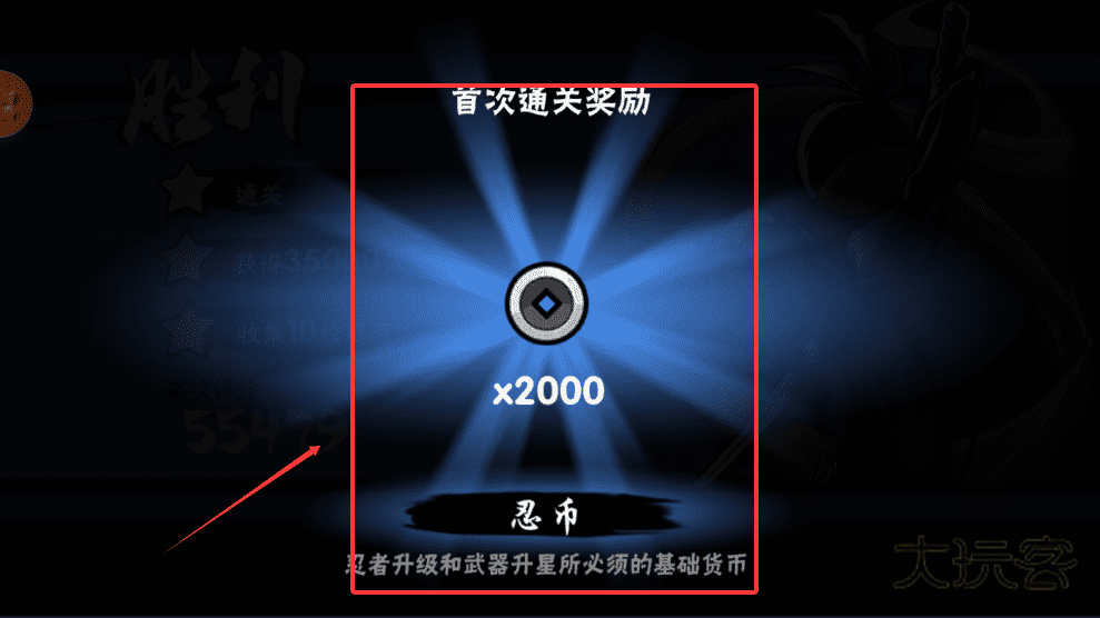 2、首次通关能获得忍币等奖励,它们可以用于升级忍者或武器,记得积少成多哦。
