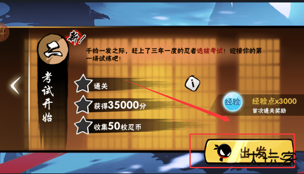 4、解锁考试后,找到带“新”标识的考试开始按钮,完成任务即可点击出发按钮开启试炼。