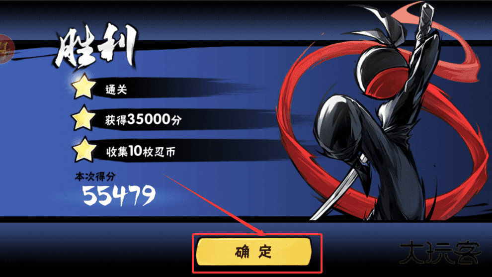 3、留意任务要求,比如获得指定分数或收集忍币,完成后点击确定按钮进入下一关。