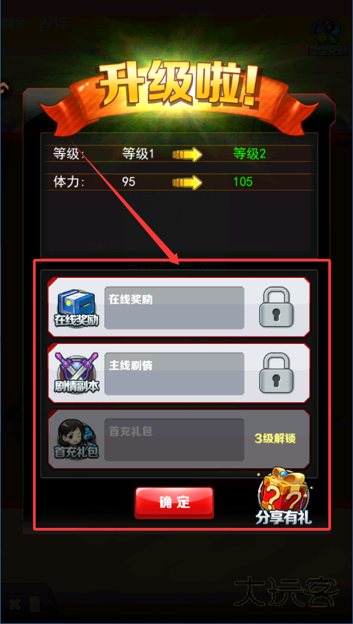 3、游戏初期跟着引导走,多做主线任务升级。等级提升后,不仅体力会增加,很多被锁住的功能也会陆续开放,比如“首充礼包”旁边标注的“3级解锁”,所以努力升级是关键。