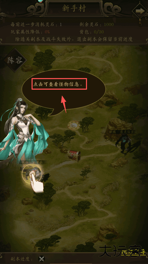 1、从新手村开始啦,记得每走一步会消耗1个灵石,初始有1000个,要省着点用哦。