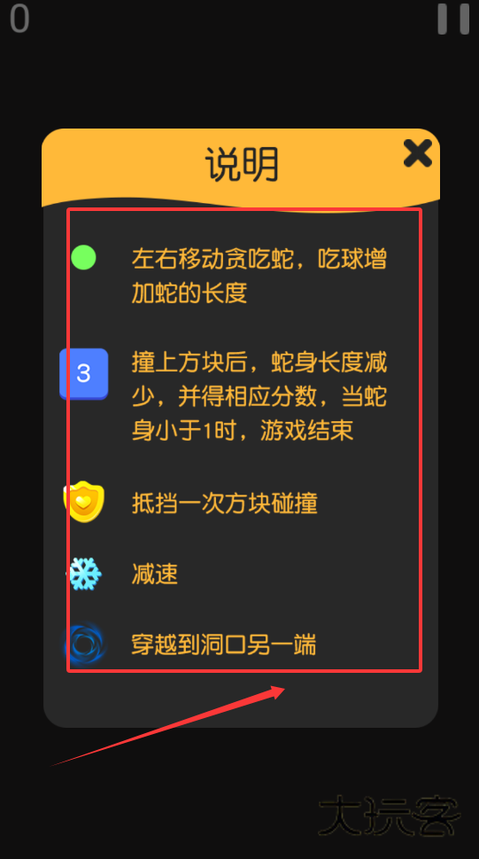 3、游戏里有几个实用技能,比如能抵挡一次方块碰撞的护盾,还有减速和穿越到洞口另一端的功能。