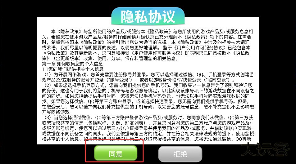 1、打开游戏后,首先会显示用户协议页面,点击同意按钮方可进入主界面。这是正常使用游戏功能必须完成的第一步。