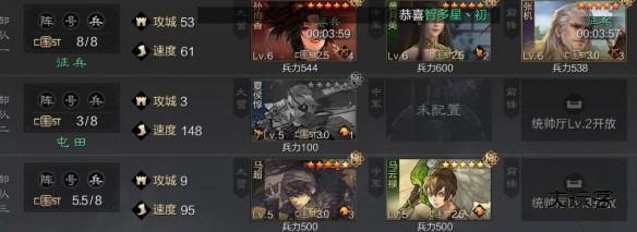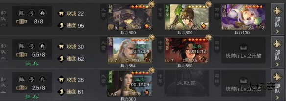 接下来是重中之重,也是开荒小白最需要改进的地方。屯田结束后,主力继续打3,期间如果主力在征兵,便可用二队打3,操作如图,将主力三个武将拆分到二三队进行征兵,补刀队放到一队,同时前锋挂上工具人,前期的3级地,最好打主城一环的,或者通过停留打3,降低战损,如果主力征兵还没好,补刀队打3又比较伤,可以将兵力最少的武将放到三队空位上征兵,征兵时间自行把握。如果主力刚打完一块4,此时补刀队还在征兵,可以将主力征兵时间拉到跟补刀队一样,征兵结束,换位置主力继续征兵,补刀队去第一队打3。