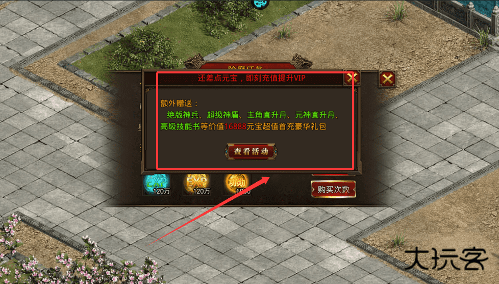 4、遇到充值提示可点击“查看活动”,了解首充赠送的神兵、直升丹等额外礼包详情,帮助更快积累元宝提升实力呀。