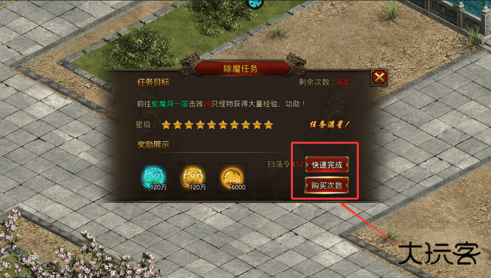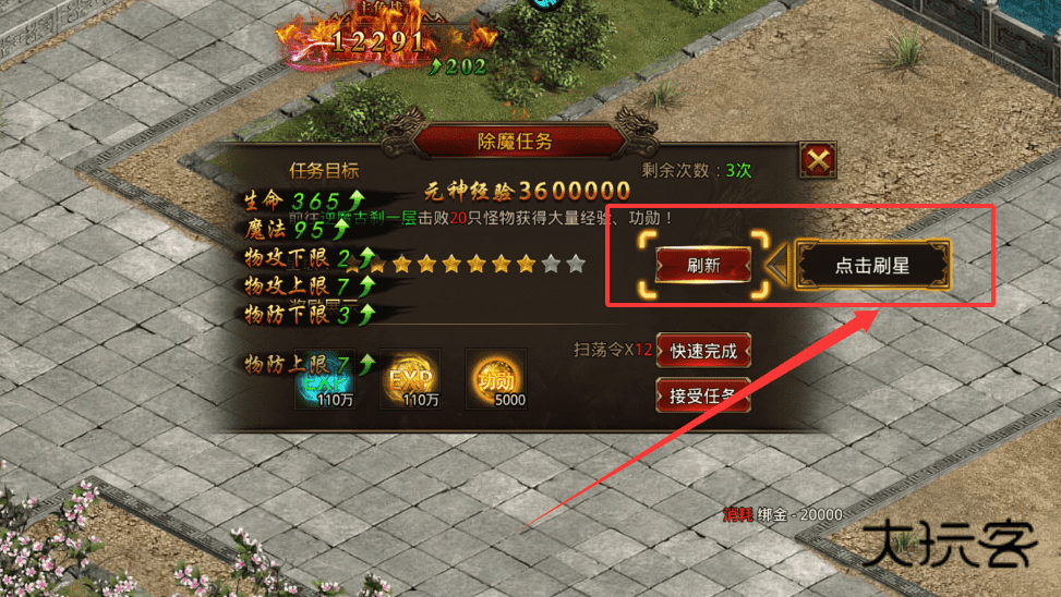 2、做除魔任务前,可先用右侧“刷新”或“点击刷星”按钮尝试提升任务星级,以获得更高经验与功勋奖励呢。