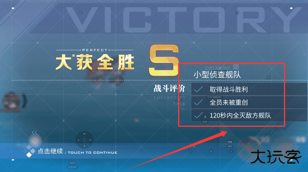 1、记得先查看任务目标,比如“小型侦查舰队”要求120秒内全灭敌人且全员未被重创。完成这些条件才能拿到完美评价,接着点击“点击继续”就能进入下一步了。