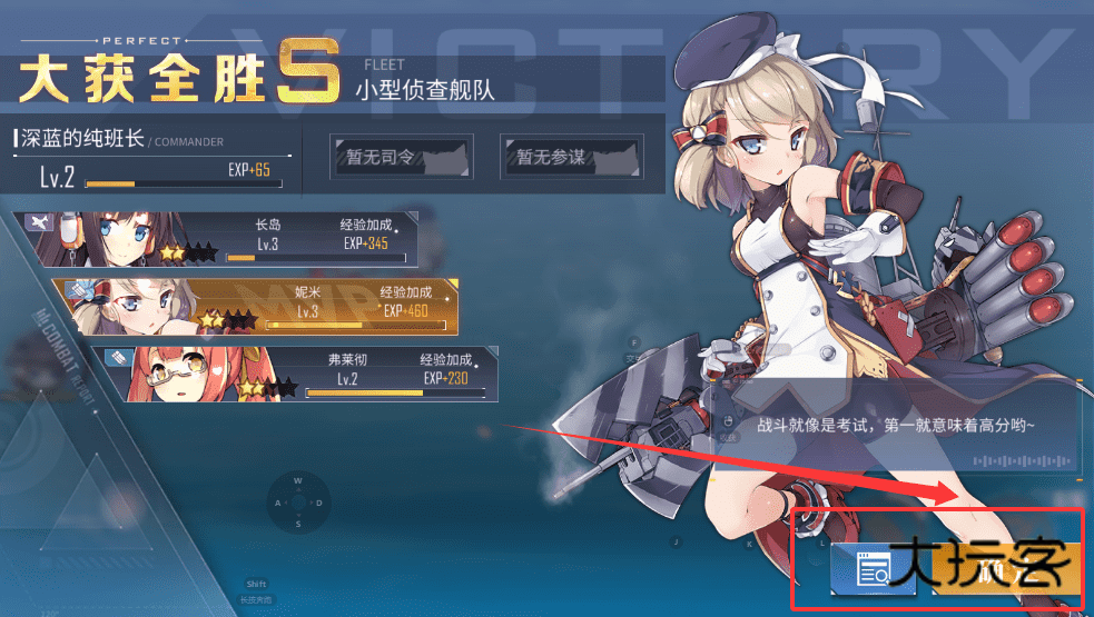 4、结算界面会展示舰队经验与等级提升情况,比如长岛、妮米等角色会显示经验加成,这时候点击“确定”就能保存进度,方便后续继续挑战了。