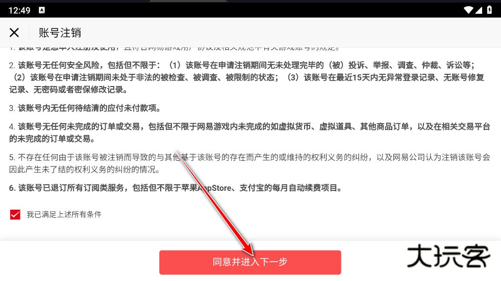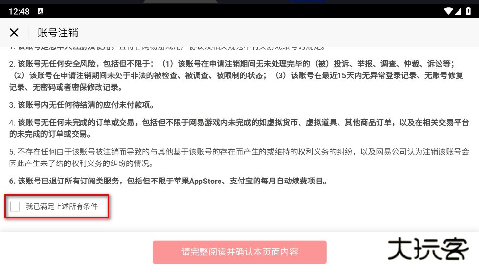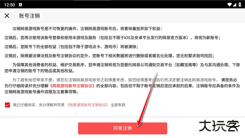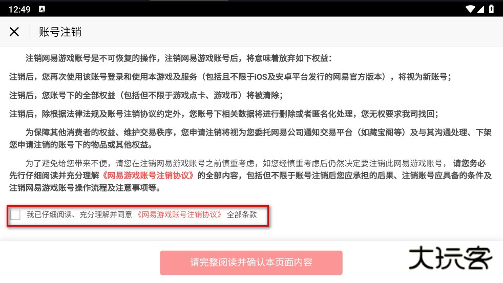 6.勾选这里的我已仔细阅读、充分理解并同意《网易游戏账号注销协议》全部条款