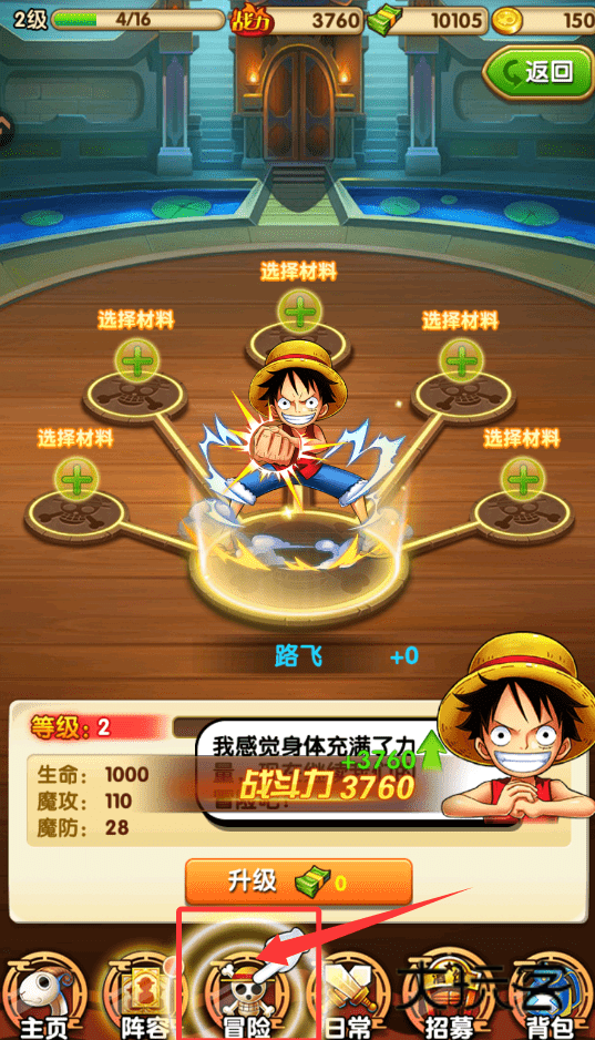 3、点击升级按钮进入强化界面,系统会提示选择消耗材料。通过消耗特定道具或多余伙伴卡片可为目标角色提供经验,成功升级后将直接提升生命、攻击、防御等多项基础属性数值。