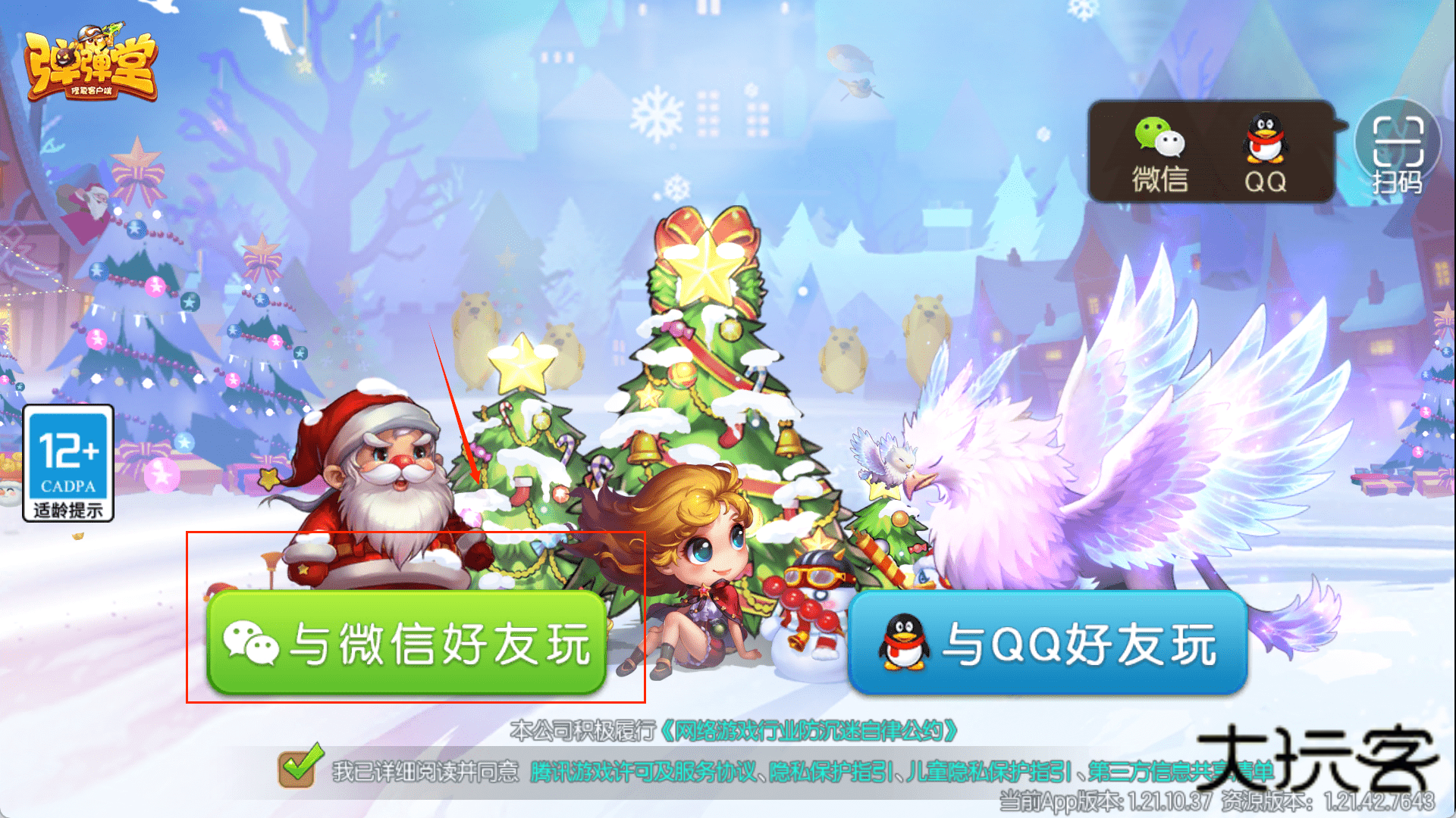3、登录主界面加载完成,画风可爱。首先要做的是年龄自检,因为游戏标注了适用年龄。然后,在界面下方,有两个大大的入口按钮,点击你想要的社交平台图标开始登录。