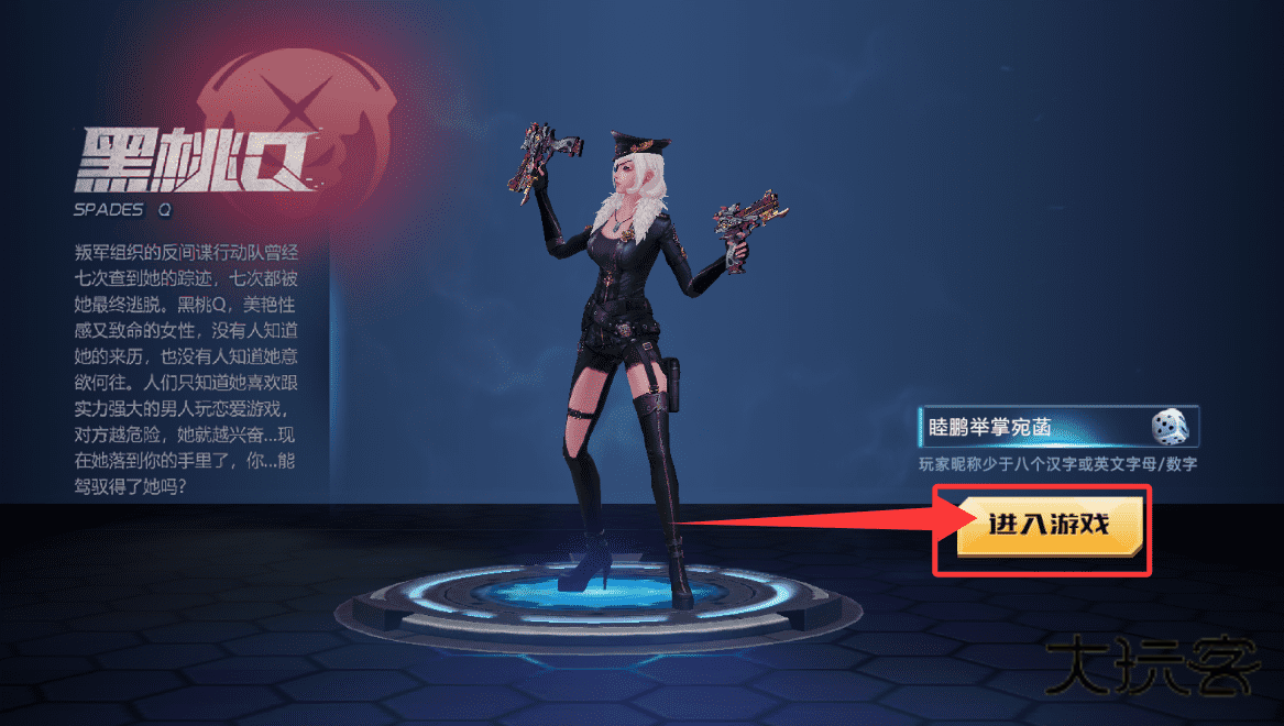 2、创建角色时输入昵称,长度控制在八个字符以内。初期跟随引导接触核心人物黑桃Q,其设定为多次逃脱追捕的神秘女性,擅长与强者周旋,此角色构成故事主线的重要引线。