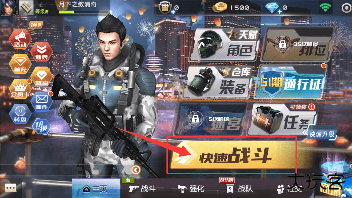 3、完成新兵引导后开启首充与月卡界面,领取天赋奖励与装备。通过主界面任务、快速战斗及战队赛积累经验,提升等级解锁更多功能,如转盘、邮件及仓库管理等基础系统。