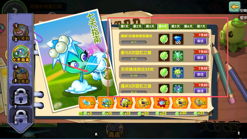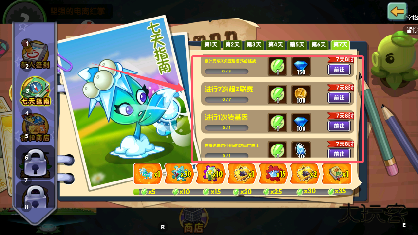2、第二天转为收集模式需要获取五颗关卡星星,这个设计引导玩家关注关卡挑战目标,同时领取的三十钻石可用于超值商店首轮兑换,开始构建自己的特色植物阵容。