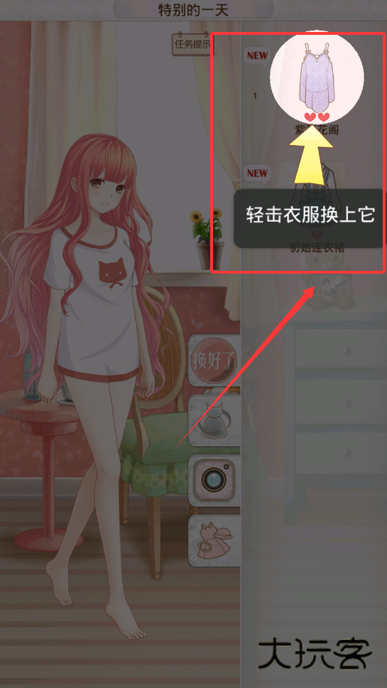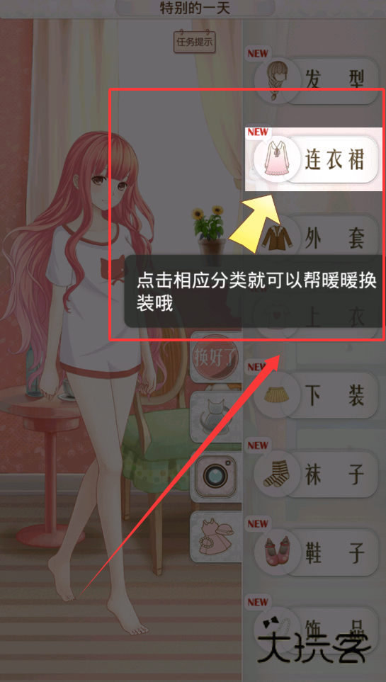 3、通过轻击心仪的衣服图标即可为暖暖换上它。记得要综合考虑所有分类,搭配出一套整体活泼可爱的造型。