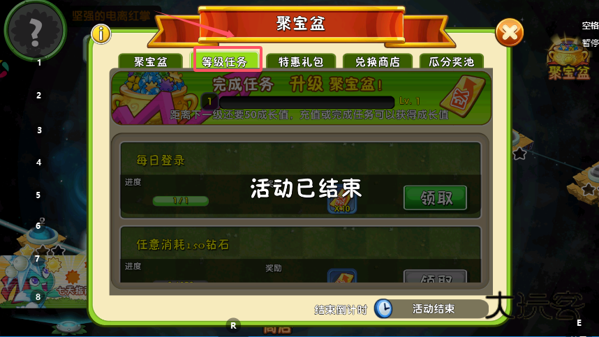 3、打开等级任务板块,完成每日登录、消耗指定钻石等任务,获取成长值以升级聚宝盆,升级后奖励的收获速度会提升,任务进度条会显示当前完成情况与剩余要求。