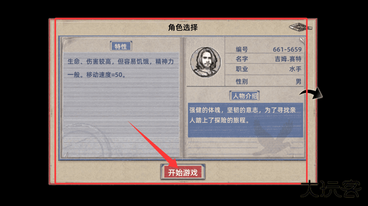 2、在角色选择界面查看各人物的特性与背景。选定如吉姆这样的初始角色,点击开始游戏即可载入开放世界场景。