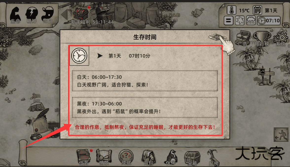 3、界面清晰展示生命、精神与饱食度三项生存指标,需通过采集、进食与休息维持其健康状态。同时注意左上角的昼夜时间提示,合理安排活动时段至关重要。