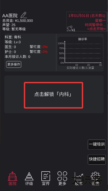 3、随着游戏进程推进,当满足特定条件时即可点击解锁内科部门。解锁后你将能够使用该科室对应的诊断或治疗功能。