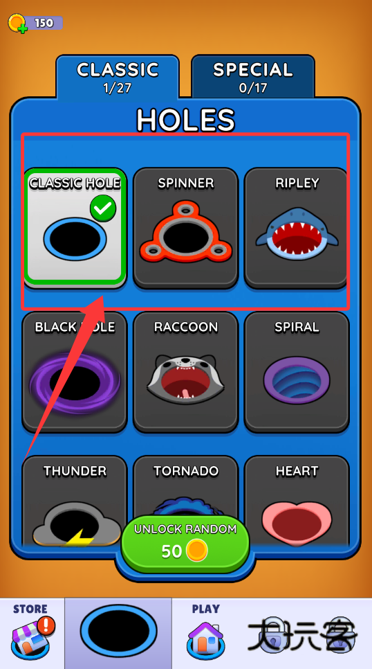 2、在关卡预览界面,可查看已解锁的黑洞皮肤或主题,例如“SPINNER”、“BLACK HOLE”等。部分皮肤需要达成特定条件或消耗货币解锁,能为游戏增添视觉变化。