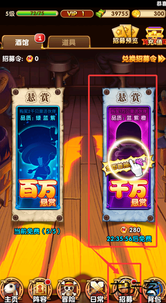 4、当等级提升至5级左右,游戏会解锁“酒馆”这一核心招募功能。进入酒馆界面后,可以预览不同品质伙伴的获取概率,并了解招募所需的资源类型,例如“招募令”或“贝里”。