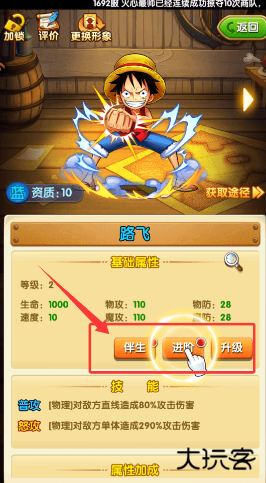 2、在阵容界面中可以查看已拥有伙伴的详细信息,包括资质、等级与各项基础属性。通过消耗特定素材对伙伴进行升级操作,能够直接且显著地提升其生命、攻击与防御数值。