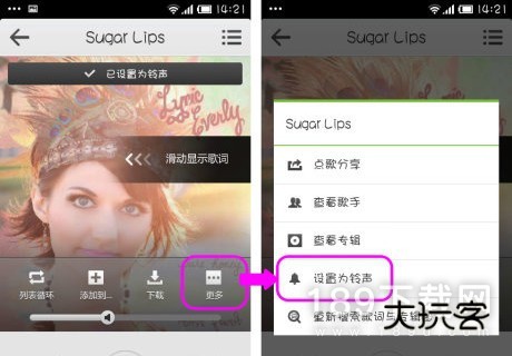 点击歌曲专辑图后打开单曲播放界面,在封面任意处点击可弹出功能选项,点击“更多”里面就有“设置为铃声”功能