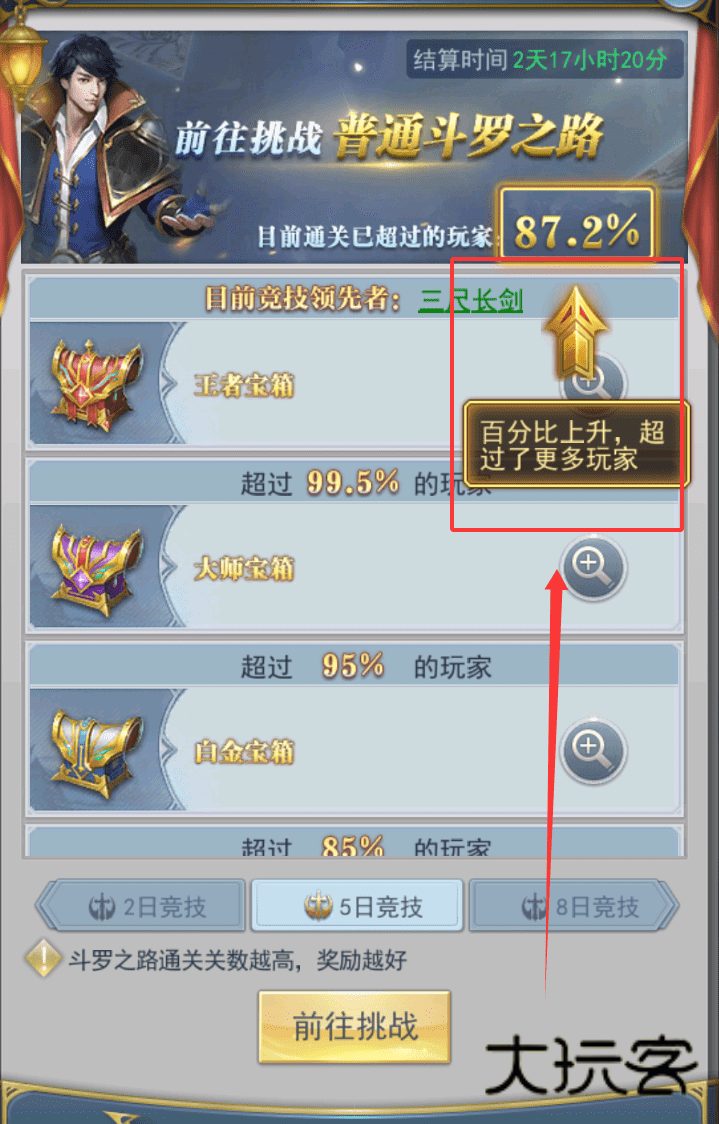 4、建议每天去挑战普通斗罗之路,关数越高奖励越好,同时关注结算时间,按时领取竞技排名奖励呀。