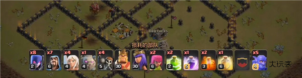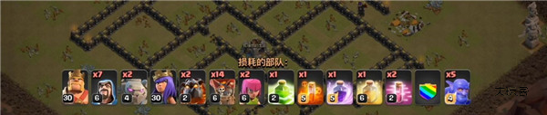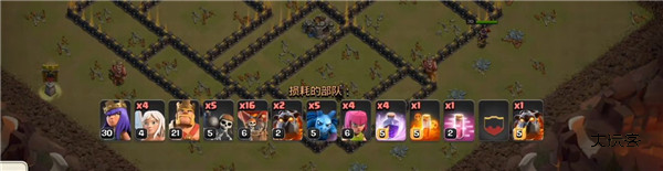 这是今天介绍的流派里唯一不适合打部落战的,也不太容易打三星,但是由于九本用它发育实在是太舒服了,所以就单独将它列出来讲讲。弹跳哥布林强就强在根本不搭理你的所有防御建筑,直奔资源,并且以收掉阵型中心的暗黑重油瓶和大本营为目标,从不拖泥带水。图中带的是配合天女的哥布林,也可以换成胖子+炸弹人的组合,当然也可以只带哥布林,看各位首领的喜好了。